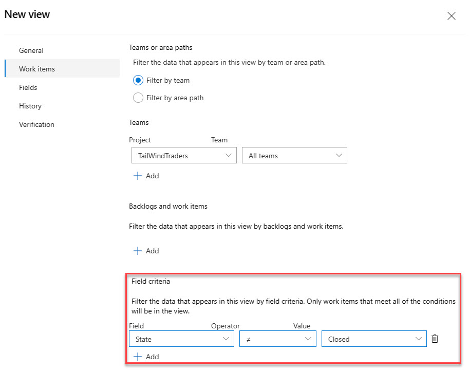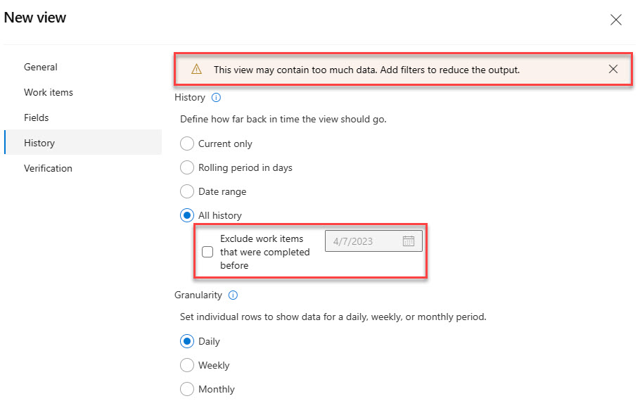 Then you can select the filters that you want to apply to the view, in this case, since this is a test project, I selected all history, and you can see the warning message on top about the amount of data. In this section you can also exclude the work items that were completed before the date that you choose.