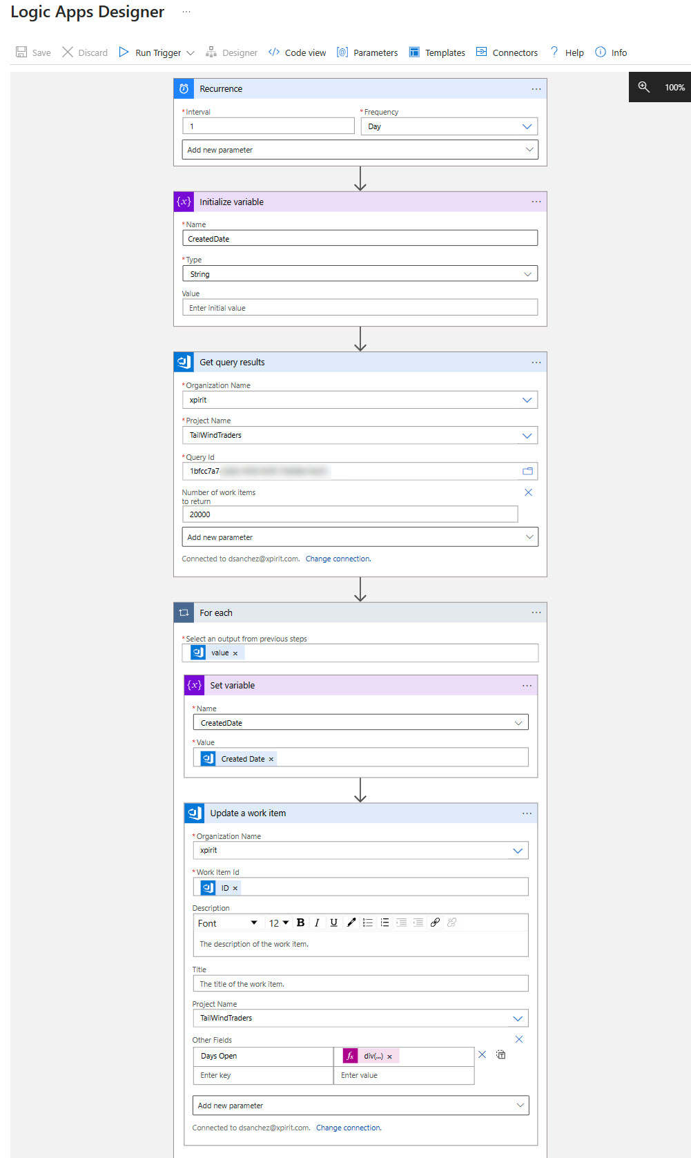 I created a variable to store the Created Date for each Work Item. Since I created a query in Azure Boards, I used the 'Get Query Results' action to get the work items that are not closed or resolved. (You can get up to 20,000 work items)
