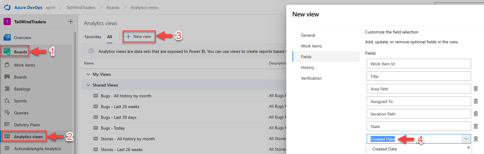 To create the Analytics view, go to the Analytics views in the Azure DevOps portal and click on the new view button. Then, select the Work Items option, add, or remove the fields that you need and make sure to add the Created Date. Click on the Continue button.