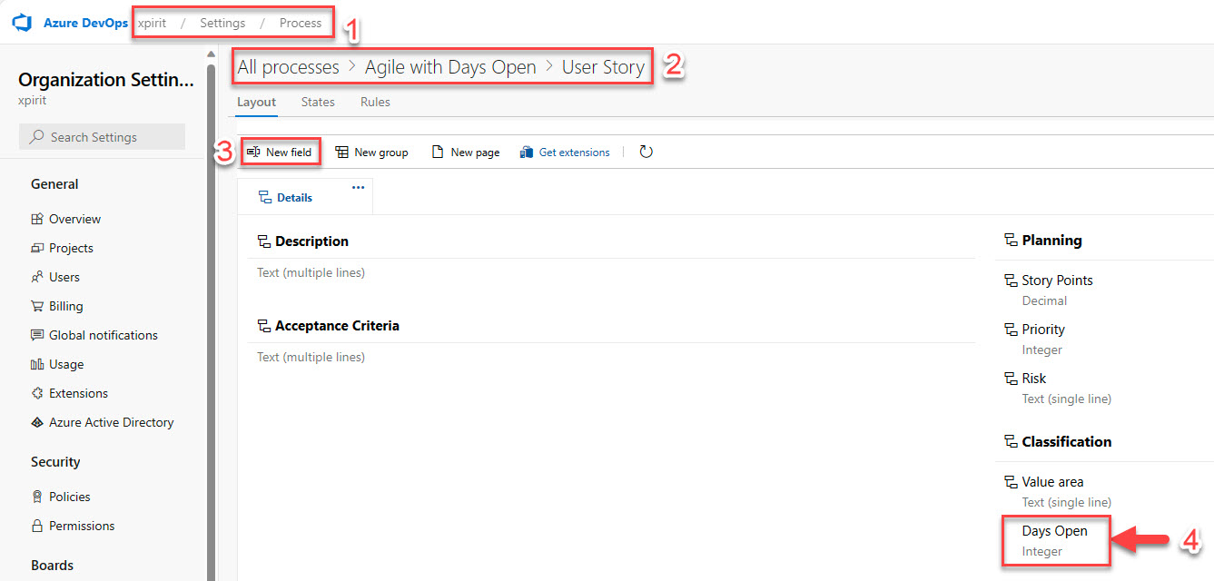 To create the custom field, go to the Process section in the Azure DevOps portal and select the process that you want to update. Then, click on the Work item types option and select the work item type that you want to update, in this case, I selected the User Story work item type.
