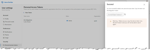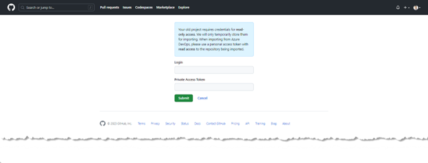 Para autenticarse en Azure DevOps, puede usar un [token de acceso personal](personal access token) con acceso de lectura al código. E ingrese su nombre de usuario y PAT en GitHub, luego haga clic en "Enviar".