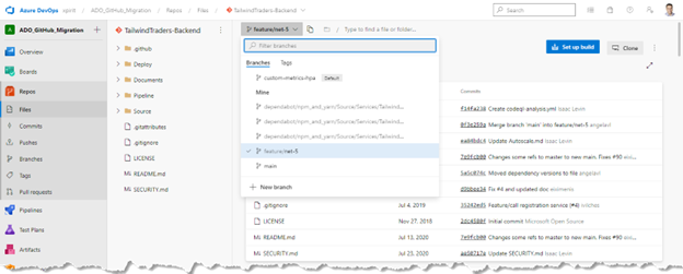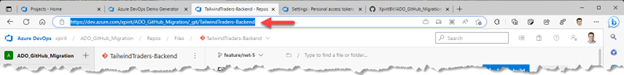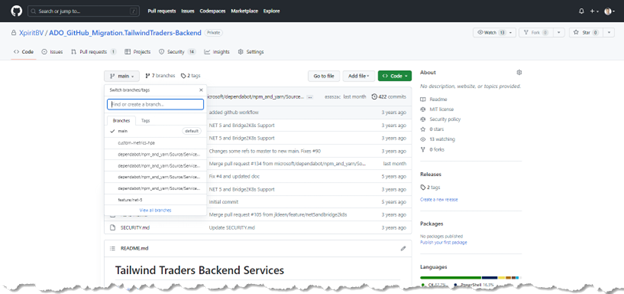Utilizamos el Generador de demostración de Azure DevOps para crear un proyecto de ejemplo con varios repositorios que contengan varias ramas. Comenzaremos la migración con el TailwindTraders-Backend depósito.
