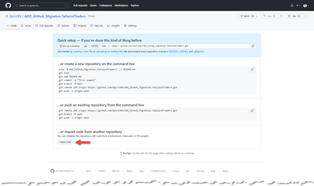 Ahora que tienes tu nuevo repositorio de GitHub, es hora de importar tu repositorio a GitHub. Para hacer esto, vaya a su nuevo repositorio de GitHub y haga clic en el botón "Importar código".