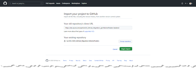 En el campo "Dirección URL de clonación del repositorio anterior", escriba la dirección URL que encontró en el repositorio de Azure DevOps en el paso 1. Haga clic en "Comenzar importación"
