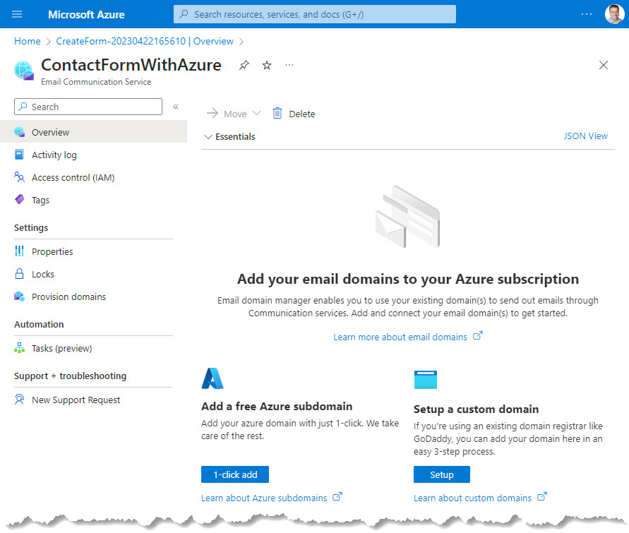 El siguiente paso fue configurar Azure Communication Services - Email Service. Esto incluye configurar una dirección de correo electrónico para enviar correos electrónicos. Al crear este servicio, puede elegir si desea usar un subdominio de Azure o si desea configurar su propio dominio.
