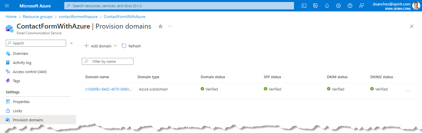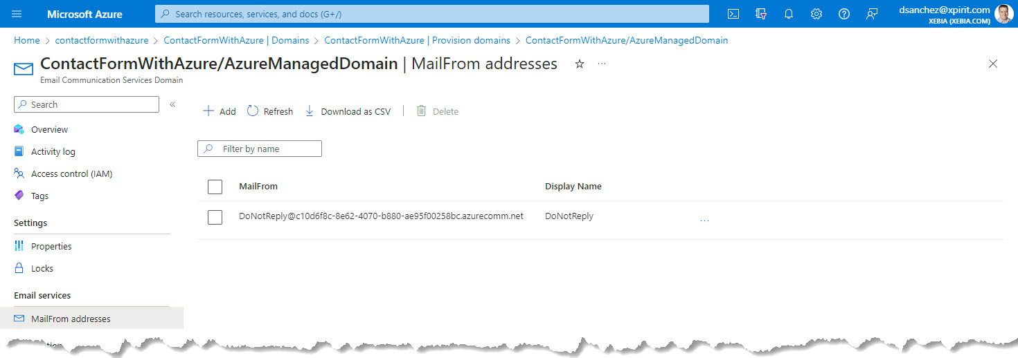 En este caso, usé la dirección de correo electrónico aprovisionada por un subdominio de Azure.