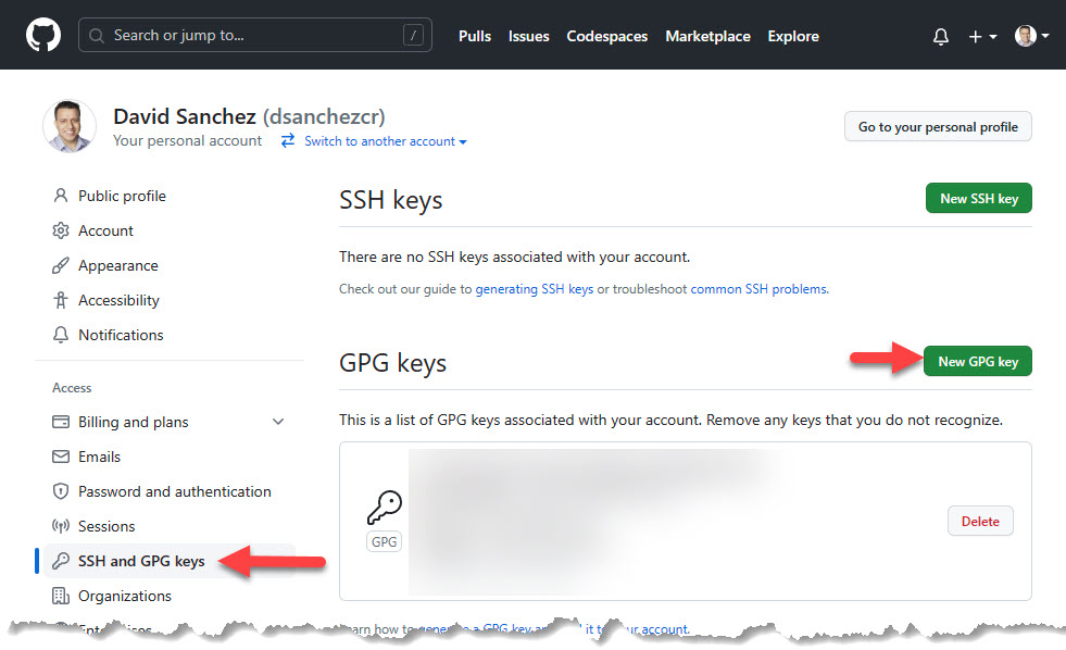 Una vez que tenga la clave, puede exportarla y cargarla en GitHub. En la configuración, vaya a las claves SSH y GPG y haga clic en Nueva clave GPG: