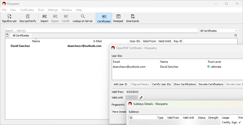 En mi caso lo hice usando Kleopatra, que es un gestor de certificados y GUI para GnuPG: