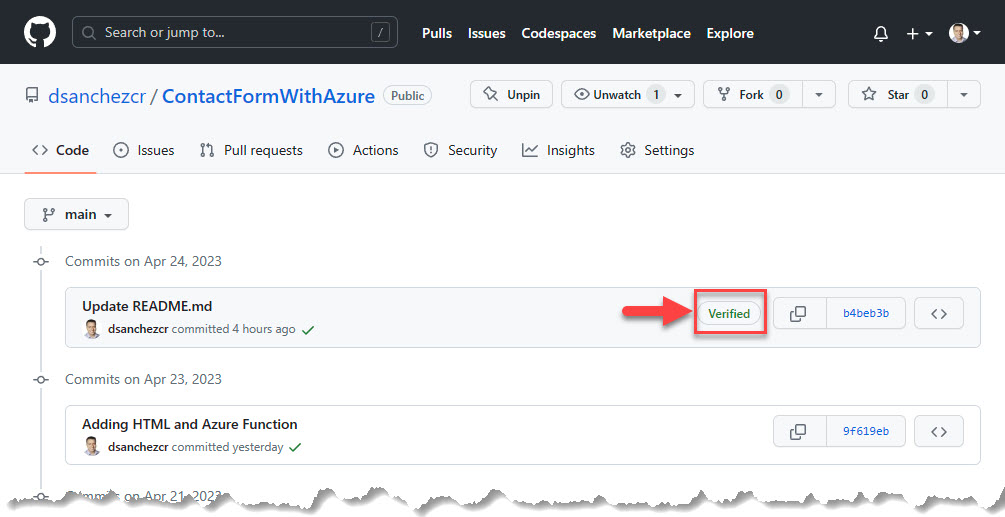 Y eso es todo, ahora GitHub mostrará la insignia verificada junto a su commit.